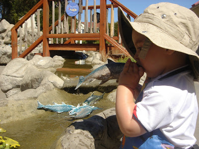 Logan wearing an apron and playing with fishes. It's educational apparently...
